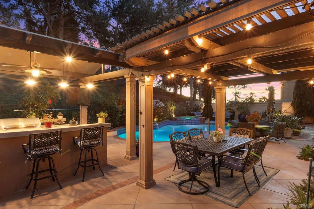 Incredible opportunity for this 3-bedroom, 2.5-bath pool home tucked away at the end of a quiet cul-de-sac in the highly sought-after Bel Air community of Mission Viejo. Upon entering the home the formal living room flows seamlessly into the dining area and onward to the beautifully remodeled kitchen, featuring upgraded custom cabinetry, soft-close drawers, granite countertops, a large center island with built-in wine chiller, high-end Samsung appliances, and a sunny dining nook overlooking the spectacular backyard and pool. The kitchen opens directly to the family room with a fireplace and serene views of the pool and spa. The primary suite is a true retreat, offering a spa-like bathroom with a travertine-lined walk-in shower and bench, granite counters, dual vanities with soft-close drawers, designer lighting, framed mirrors, and a walk-in closet with sleek opaque silhouette glass sliding doors. Both the hallway and downstairs bathrooms have also been upgraded. Designed for indoor-outdoor living, the resort-style backyard is truly an entertainer’s dream. The covered outdoor kitchen is complete with bar seating, a premium five-burner Bull BBQ with two side burners, Flame outdoor refrigerator, and hot/cold water sink. The sparkling pool and attached spa have newer Pentair pool equipment, all conveniently controlled via a phone app--along with outdoor lighting and music in both the front and back yards. Additional highlights include solar system (owned)for both house and pool (our sellers heated pool April thru October & with AC in summer had an electricity cost of approximately $400 over 12 months!), newer dual pane windows throughout, plantation shutters and newer AC and furnace. The oversized 2-car attached garage includes cabinetry. shelving and epoxy floors. As an added bonus, the home includes membership to Lake Mission Viejo, offering boating, fishing, beach access, concerts, and an unforgettable Fourth of July fireworks show.